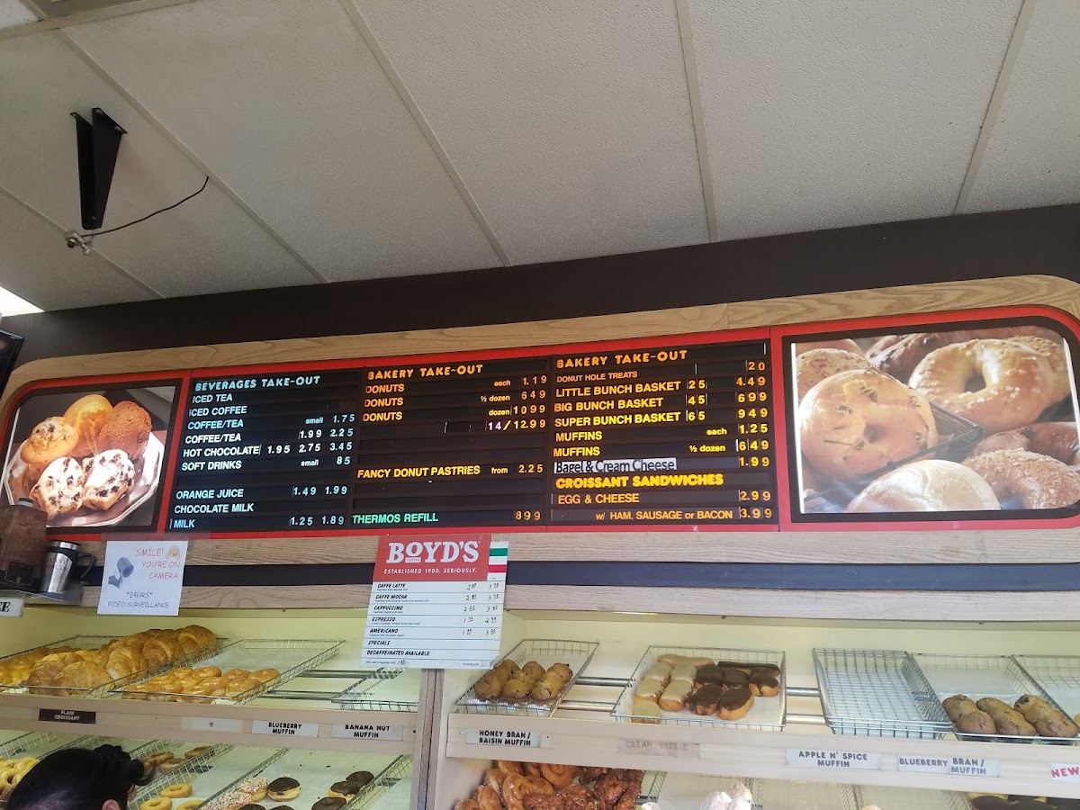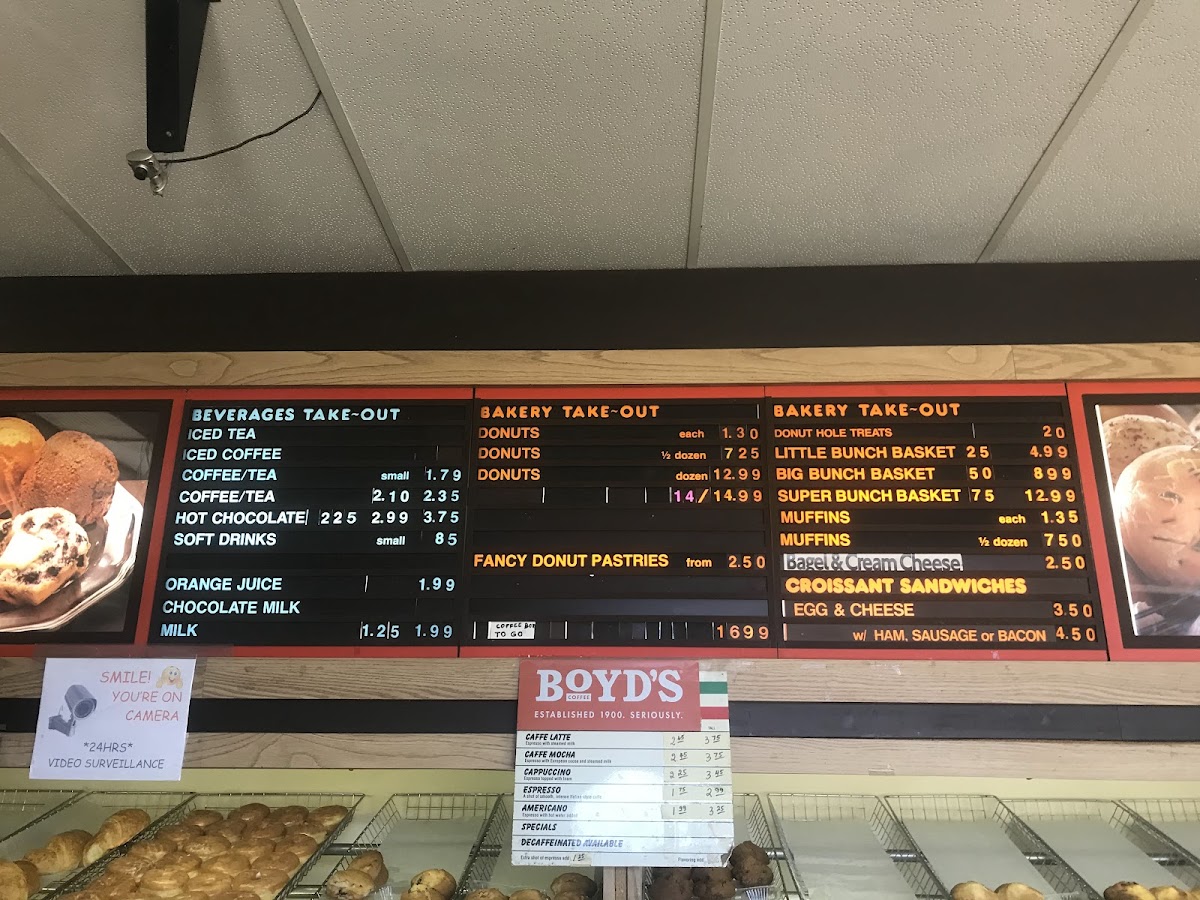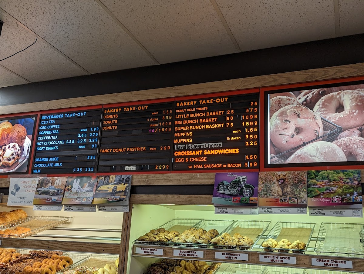 The menu features a variety of bakery items centered on donuts, alongside breakfast sandwiches and an assortment of beverages. It is suitable for breakfast, light meals, or coffee breaks, offering options for quick orders or casual dining.